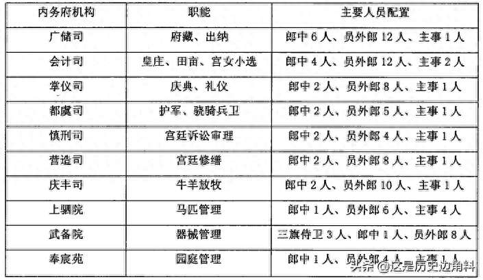 七司三院分工分工各不相同,其中主要人员如郎中、员外郎、主事、三旗侍卫等职,均由内务府包衣担任,正如下表所示: