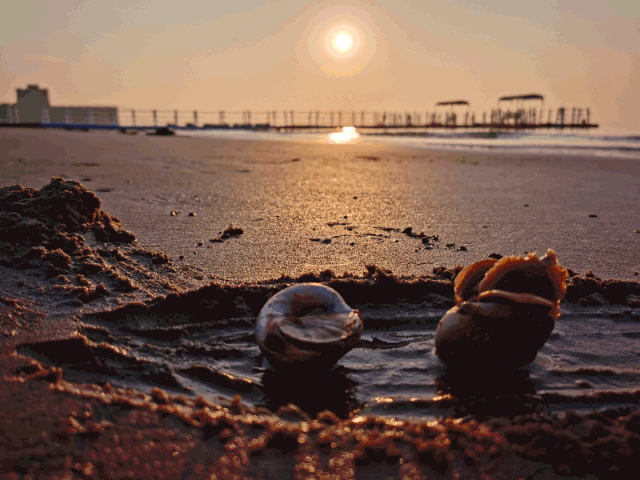 山海关老龙头 老龙头附近这片海滩上可有不少宝贝,黄蛤是最常见的,也有许多白蛤。如果你在沙滩上看到U形小孔,恭喜你,马上就要收获美味的蛤蜊了,除此之外在这片海滩上,你还可以收获胖嘟嘟的猫眼螺。