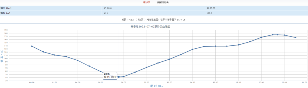 7月2日(周六)早上7:35分,秦皇岛海域潮高42cm。也是从这天开始潮高开始走高,然后等到农历十五前后会在此走低。