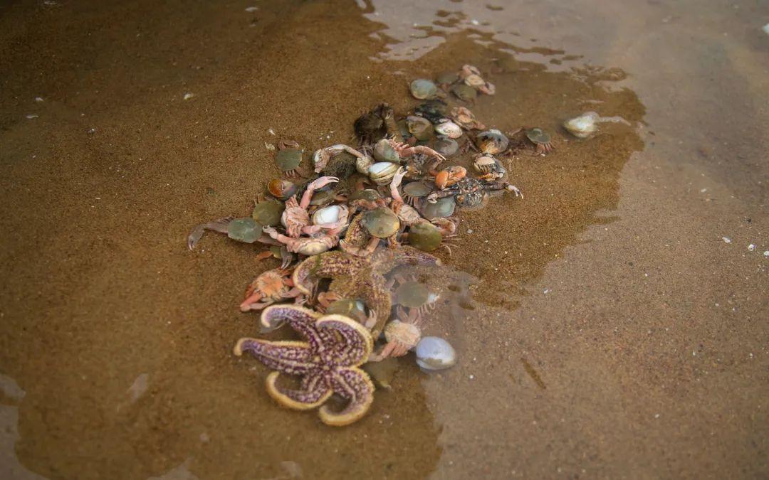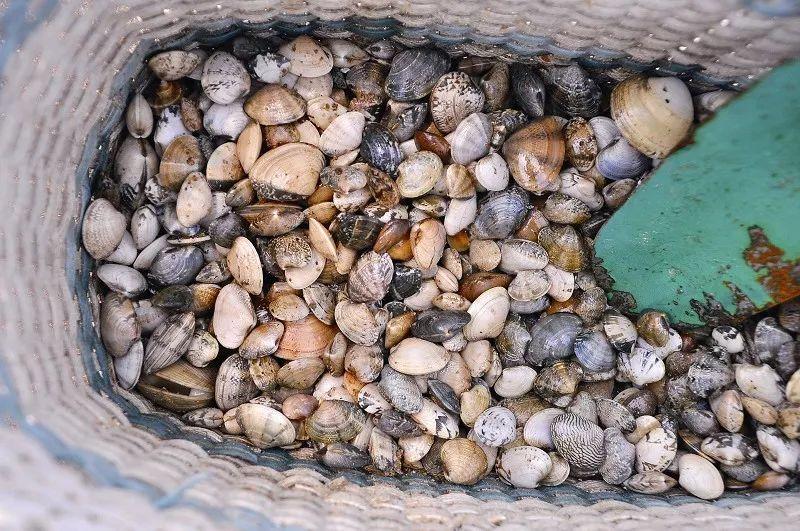 海泥里藏着的螃蟹,种类不同的蛤蜊、海螺;礁石上攀附着海虹、海蛎子;在滩涂的水洼里偶尔还会捡到海胆、海参、海蜇、皮皮虾……