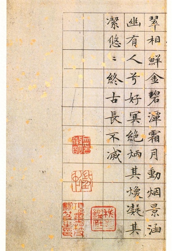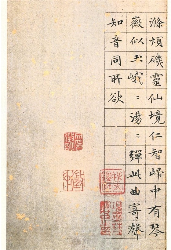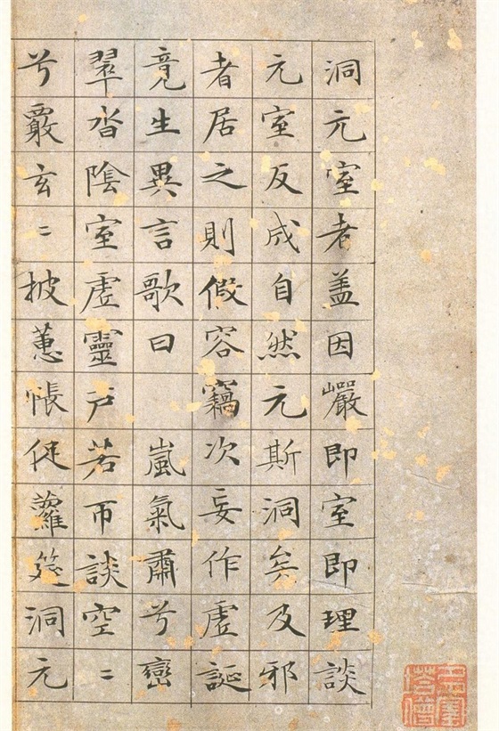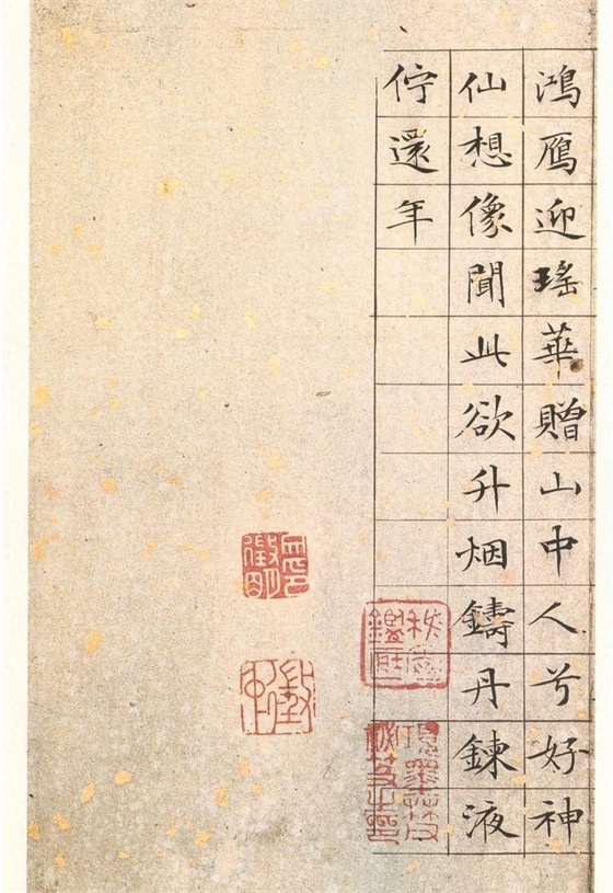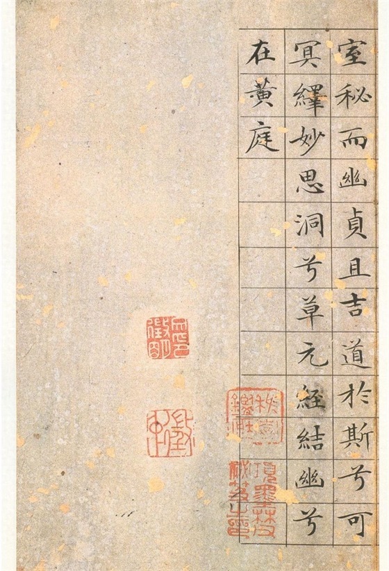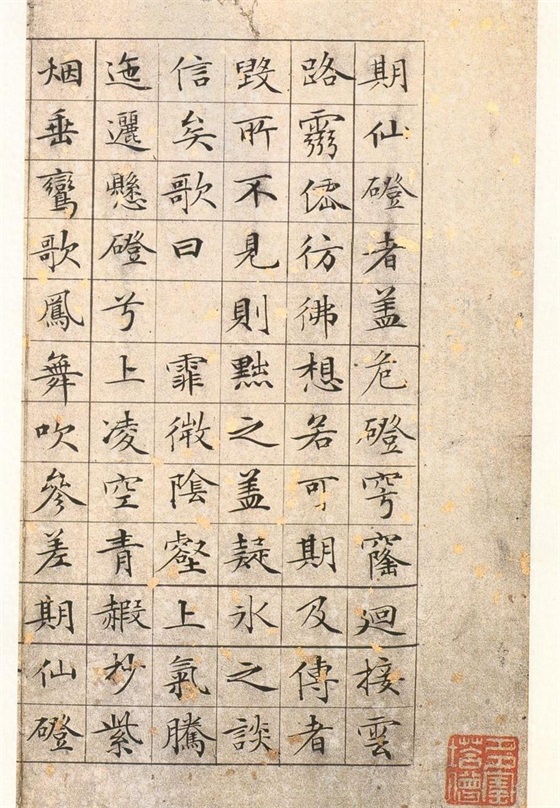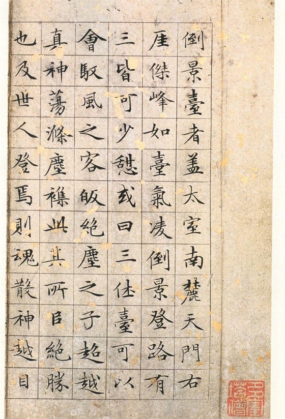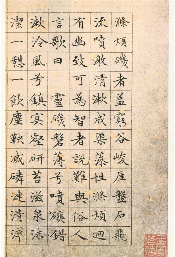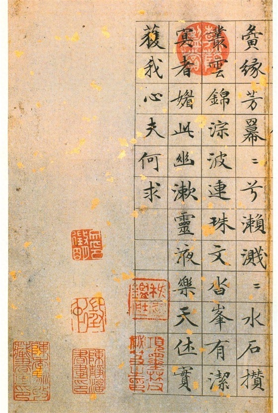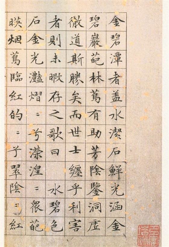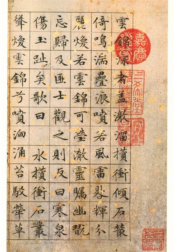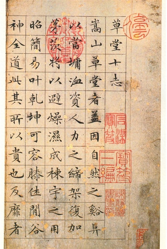 台湾故宫博物院藏明代文徵明小楷《草堂十志》纵 23.2、横 28.4 厘米。 文征明的这件小楷作品《草堂十志》字迹清秀、婀娜多姿,是其传世之作中的一件精品之作。钤有乾隆、嘉庆、宣统内府鉴藏印。
