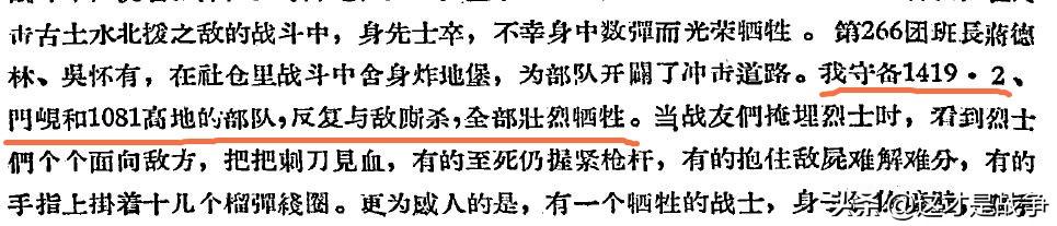 《志愿军20军抗美援朝战争战史》在第二章的第四节“政治工作”的第二点“忍受艰苦,英勇战斗”中再次强调了180团2连,指出:“我守备1419.2、门岘和1081高地的部队,反复与敌厮杀,全部壮烈牺牲。这些英勇的部队是第175团第6连一个排(作者注:1419.2高地),第179团第8连一个排(作者注:门岘),第180团2连及第3连一个排(作者注:1081高地)。”见下图。