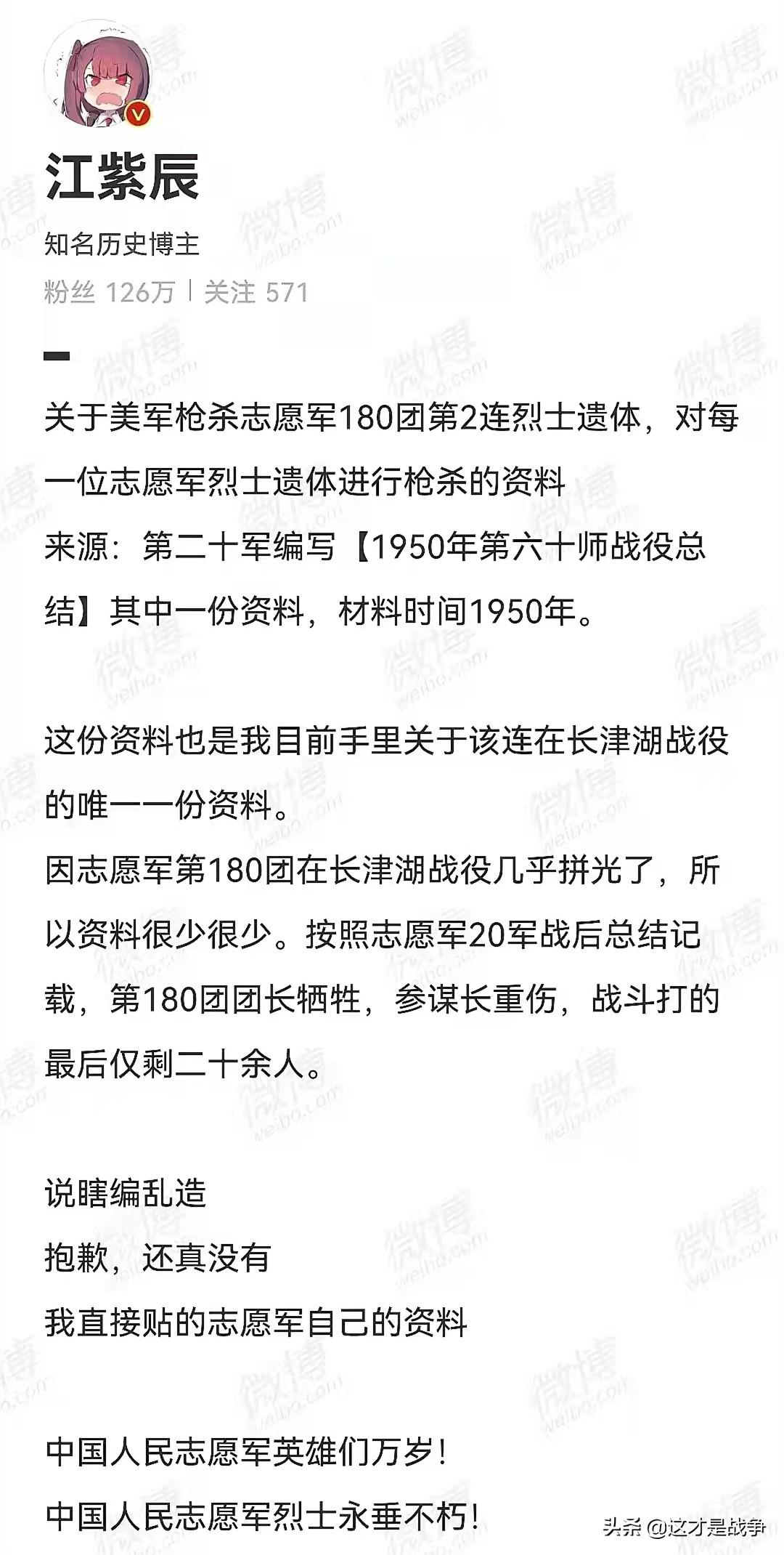 在被网友质疑后,他已经删掉了。因为非常明显,这句话是支持不了“美军补枪”一说的。只能说明180团2连战斗到了最后,除了一个临阵脱逃的副班长,其他全部牺牲。