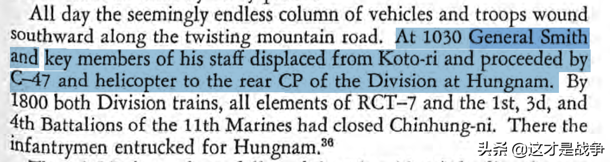 标记成蓝色的这段话翻译过来说的是:“10时30分,史密斯将军及其主要工作人员从古土里撤离,乘坐C-47和直升机前往位于兴南的师指挥所。”