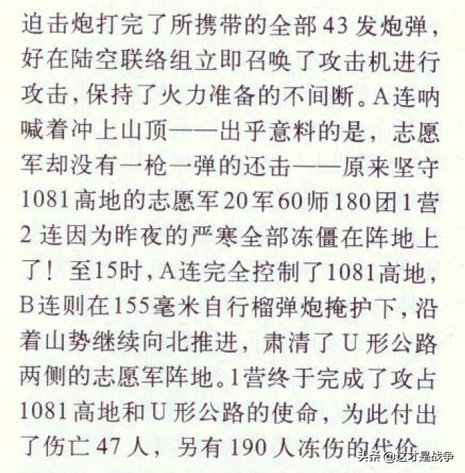 美军战史的记载和志愿军20军原始档案及《抗美援朝战争战史》的记载是一致的。180团2连不是冰雕连,他们是“与敌反复激战,全部牺牲”。虽然志愿军这边因为180团伤亡严重,2连全部牺牲,对1081高地战斗的情况不了解,但美军战史可以作为补充。
