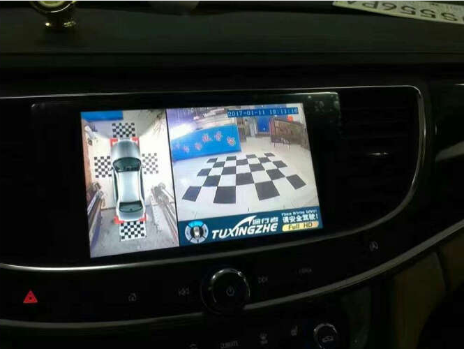 360度全景行车记录仪,安装是通过两个后视镜和前后四个高清摄像头采集来的数据,经过特殊的处理,能够形成一幅实时动态的360度全景鸟瞰图的哦,在车载DVD显示或者加装在左侧的显示器里,右侧则是汽车的行驶方向图(本人文字表达能力差,说的不是很清楚,大家可以看下面的图,就能明白了。)图片比例是可以调整的。我自己的实拍图,可能没那么高清。