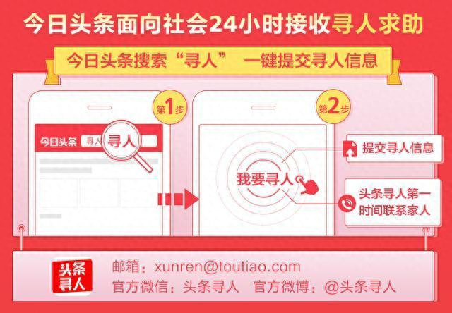 头条寻人是一项面向全国的免费公益项目,致力于帮助各类家庭寻找走失者,其原理为在走失者失踪地点附近弹窗寻人信息,借助头条庞大用户,极大提升可能目击者帮助寻人的几率。过往成功案例已经证实,头条寻人的精准地域弹窗对短期内走失的老人、精神障碍患者等移动能力较低的人群,有较高的寻人成功率。 邮箱:xunren@toutiao.com