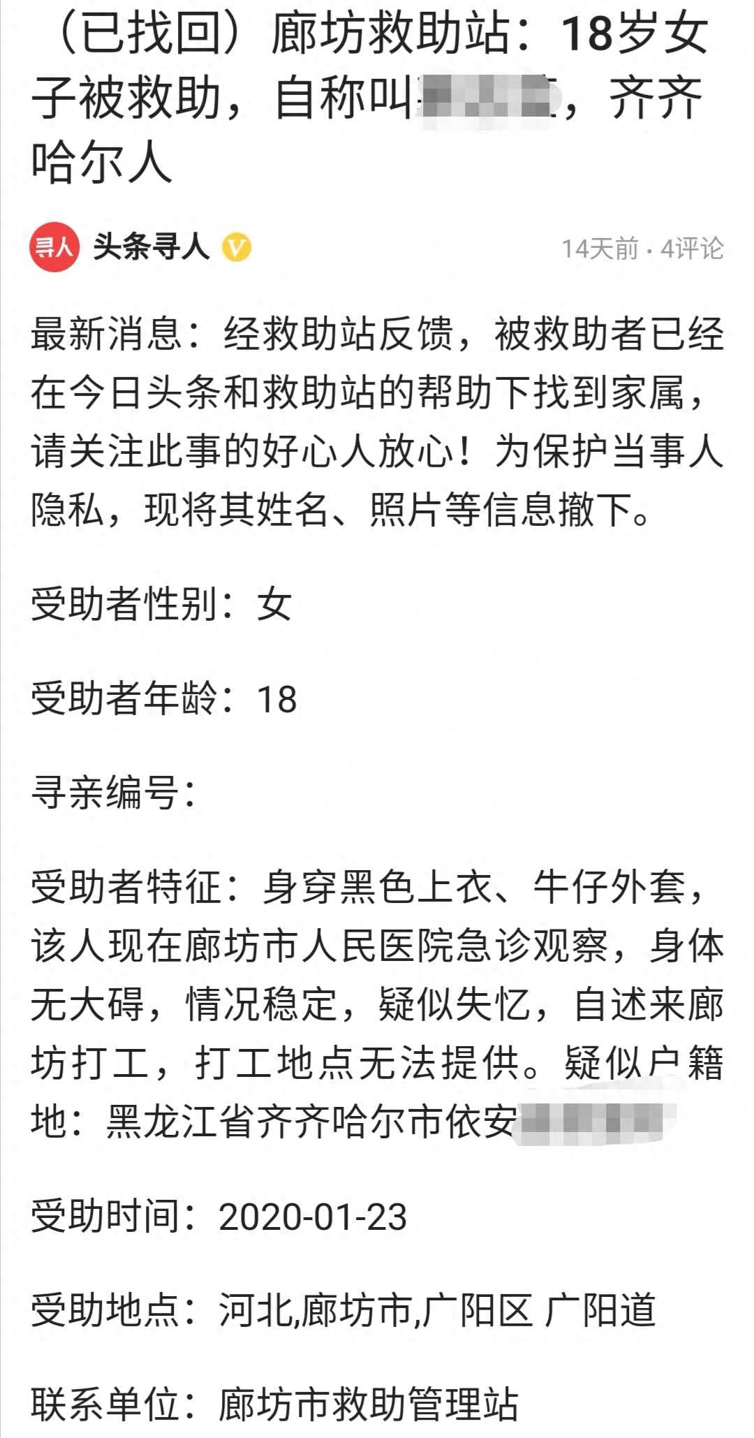 为了能够早日帮助受助女子找到亲属,廊坊市救助站立马将信息传给了头条寻人。头条寻人在接到信息后,第一时间发布了有受助女子的寻亲启事,并在依安县部分地区发送了消息弹窗。