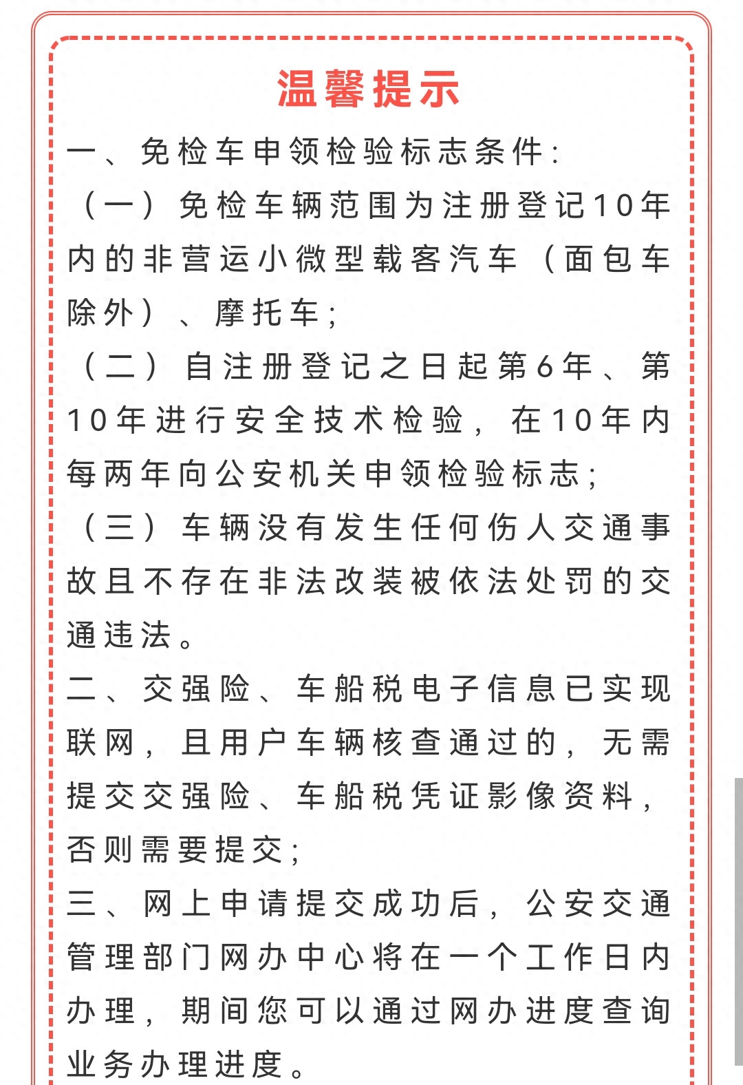 免检车辆范围:注册登记6年内的摩托车、非营运轿车(含大型轿车)和其它小型、微型载客汽车;不包含面包车,及超过10座(含)及以上的车辆;车辆必须自出厂之日起4年内办理了机动车注册登记手续;车辆在免检期间,未发生任何造成人员伤亡的交通事故,且不存在非法改装;交强险、车船税正常完成缴纳;记得提前处理完交通违法违章;