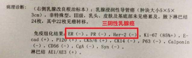 三阴乳腺癌指的是乳腺癌的病理检查中以下三项指标均为阴性的乳腺癌: