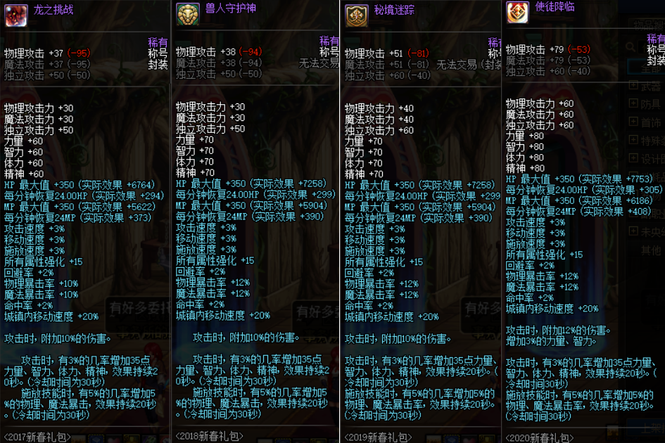 虽然如此,但不得不说龙之挑战这个称号确实很强,就算是对比这几年的年套称号,龙之挑战的差距也不算大。不过比起今年的使徒降临称号,龙之挑战称号还是少了30点的三攻,2%的双暴,以及2%的附加伤害,看来随着时间的流逝,旧时代的产物终归会被淘汰的。