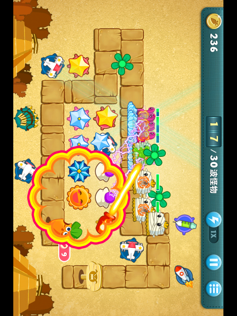 一定要先打到深海第9关卡,因为深海主题第3关和深海主题第9关牛奶饼干比较多,刷饼干和牛奶还有怪物窝都是在这里刷的选择这个关卡的原因是因为这个关卡一般打3波怪就会有礼盒进入深海就9关卡,开始按如图所示放置一个。