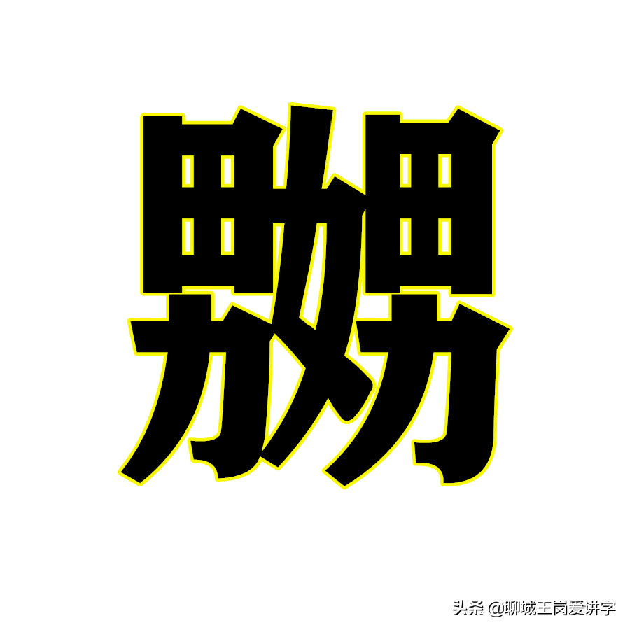 先看字型,外边两个男生中间夹着个女生。古人造字也很有意思,咱也可以这么理解:你想啊,两个壮小伙同时喜欢上了一个女孩,是不是要争斗一番? 以至于打破头皮,相互的恶生气。这个字在广东的粤语里表示生气的意思。