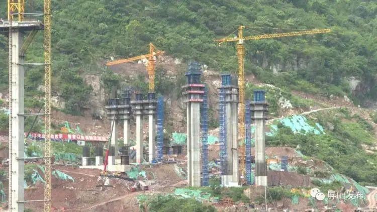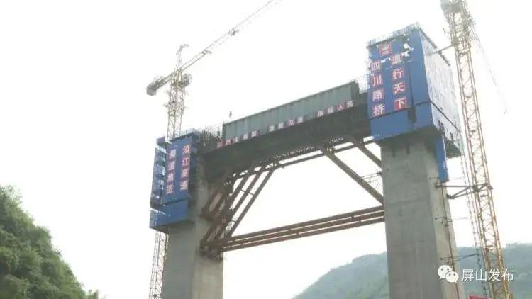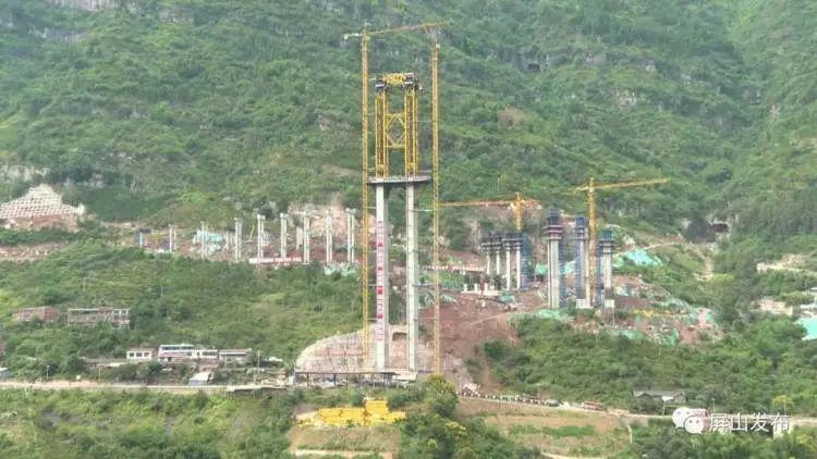这两天,在位于屏山县新市镇的西宁河特大桥施工现场,大桥的桥墩已经初步成型,立在山间,桥墩顶部的起重机正忙碌地运输材料。