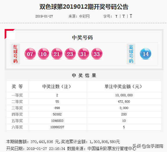 双色球第2019012期开出奖号:07 10 21 23 31 33 + 14,红球大小比为4:2,首尾间距为26,蓝球为大号。