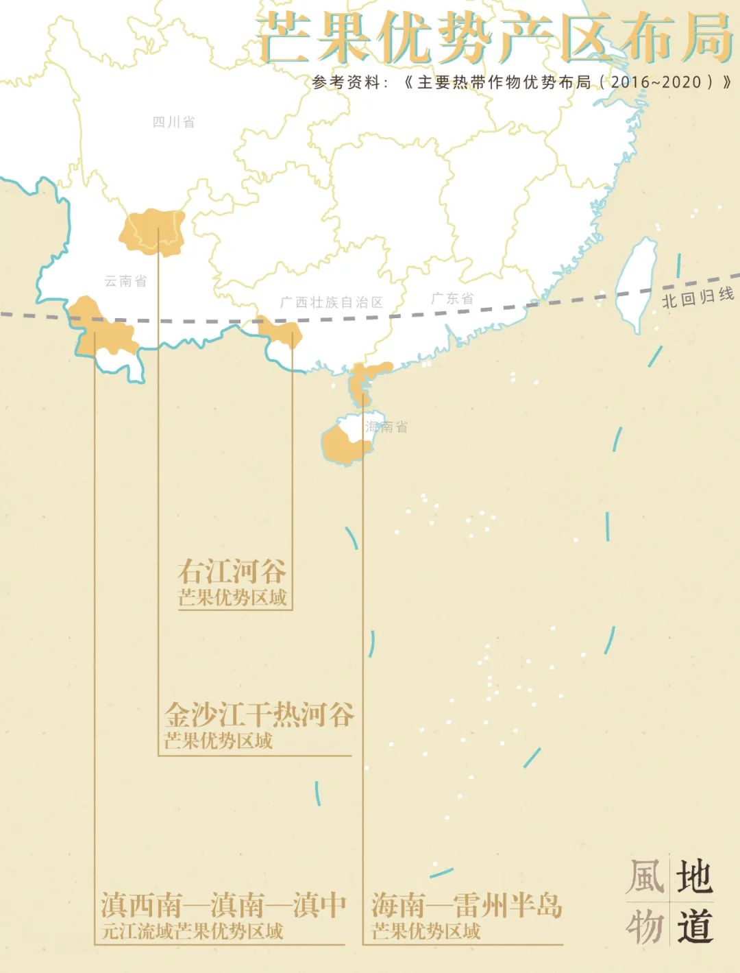 芒果是典型的热带作物,气候条件是它在我国生长最核心的限制条件,因此,要说中国哪里的芒果最好吃,我们首先要跟着优势产区找。