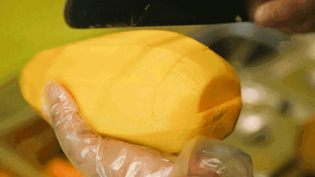了解完这些主要的芒果品种和产地,挑一个你喜欢的芒果,最大限度地紧贴着芒果核,左一刀,右一刀,取下两大瓣带皮果肉,小刀仔细地划好“井”字格,再用勺子一挖,让大块大块、方方正正、整整齐齐的果肉掉到盘子里。