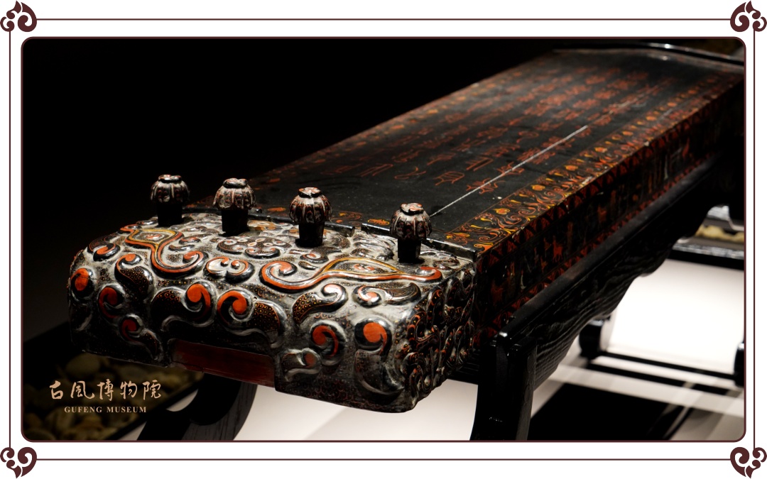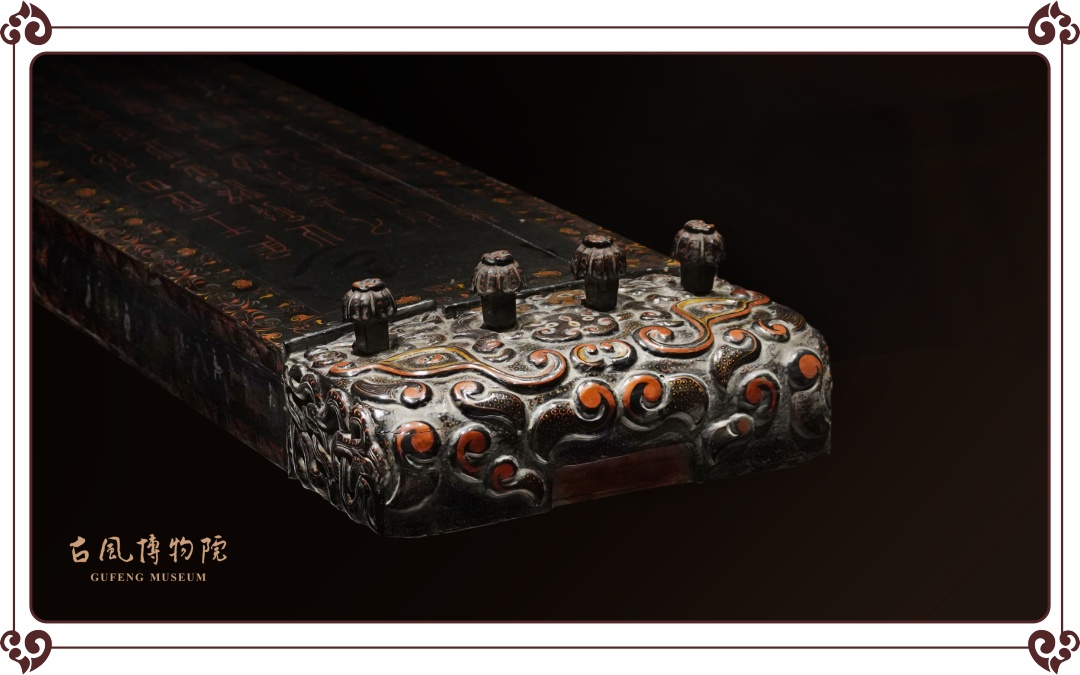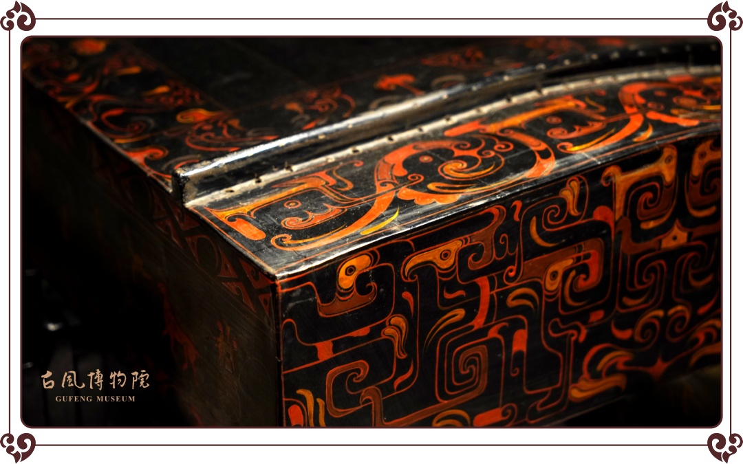 这把古瑟通体髹漆彩绘,瑟面四周绘有卷云纹及凤鸟纹,瑟尾饰精致雕刻,中间有小篆书写铭文,旁侧立墙板上绘满贵族出行图,当之无愧的锦瑟。时至今日,瑟面精美的纹饰依然十分清晰,通体髹漆无损,色泽艳丽,保存之完好令人惊叹,也为研究古瑟提供了宝贵的依据。这把锦瑟看上去就像新的一样,只因其从未入土,为传世珍品,加之漆器抗虫抗腐,才能历经千年风霜依旧完好如初。