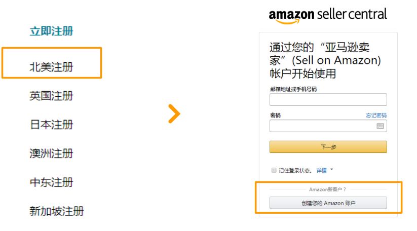 打开https://gs.amazon.cn/,点击右上角“前往站点注册”,选择“北美注册”,点击下方“创建您的Amazon账户”
