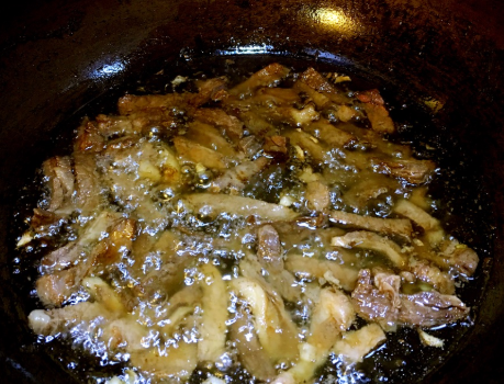 第五步,待将油烧至7成热的时候,便可以将控干水的牛肉条逐个下入在锅中开始炸,待将牛肉条炸至颜色变深的状态,即可出锅,控干油后撒上点熟白芝麻便可以开始享用了。