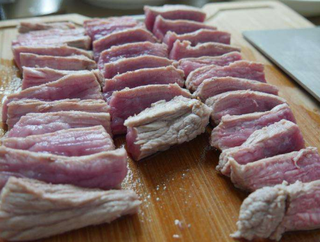 制作过程:第一步,首先准备出需要的牛肉,将其清洗干净后,重新加上清水浸泡,差不多2个小时的时间,将牛肉中的血水充分泡出后,捞出顺着纹路将牛肉切成长条状;