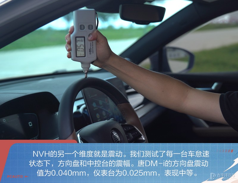 经过实际测试,唐DM-i的方向盘震动值为0.040mm,仪表台震动值为0.025mm,表现中等。不过单看这两个数字你可能没什么概念,这里可以提前透露的是,作为一台四缸车型,唐DM-i在震动抑制方面,竟然输给了一台三缸车。
