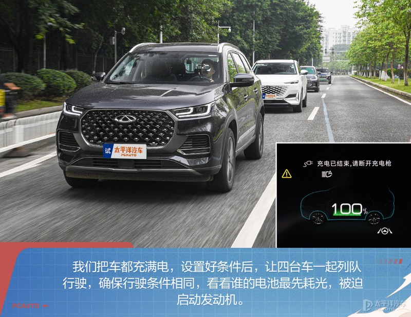我们把四台车都充满电,设置好条件后,让四台车一起列队行驶,确保行驶条件相同,看看谁的电池最先耗光,被迫启动发动机。唐DM-i搭载了容量为21.5kWh的刀片电池,官方NEDC纯电续航112km,那么实际开起来会打多少折呢?