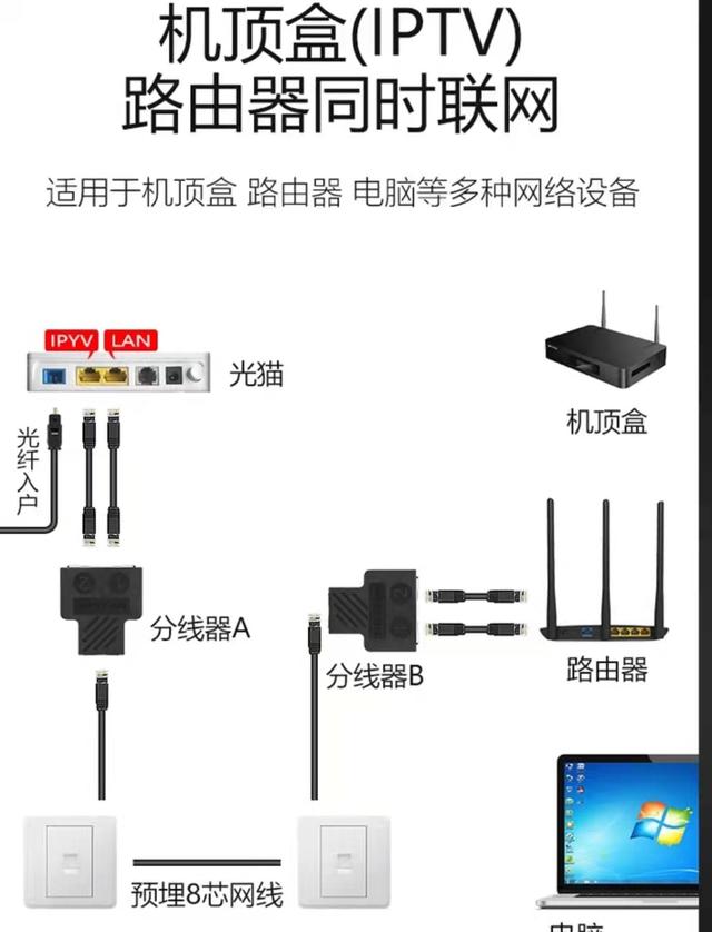 第一种方法:就是把一根网线直接“一分为二”,同时连接IPTV机顶盒和宽带。