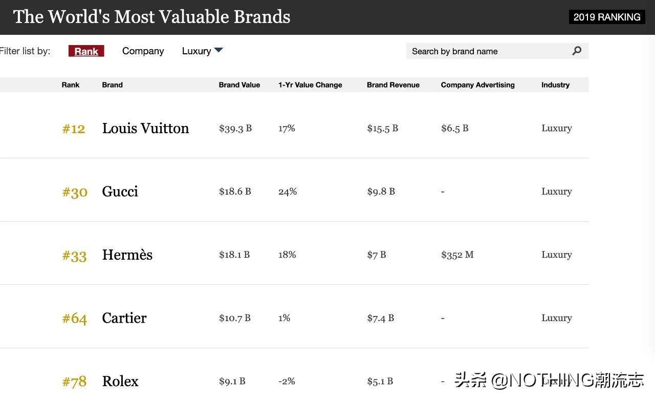 这十大排名从 品牌价值/历史文化/价格/等几个纬度出发,综合整理出来的,品牌价值来源《2019福布斯最有价值品牌榜单统计》,话题度综合了时尚搜索引擎发布的搜索指数,如果你也认可,它就是最公正的榜单。
