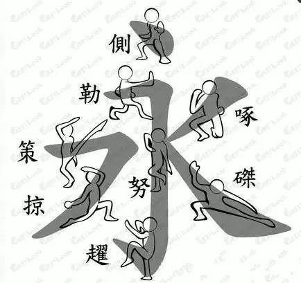 永,拆开来看包含了八个基本点画,点、横、竖、钩、提、长撇、短撇、捺,每个点画都有一个法则,即有八法。