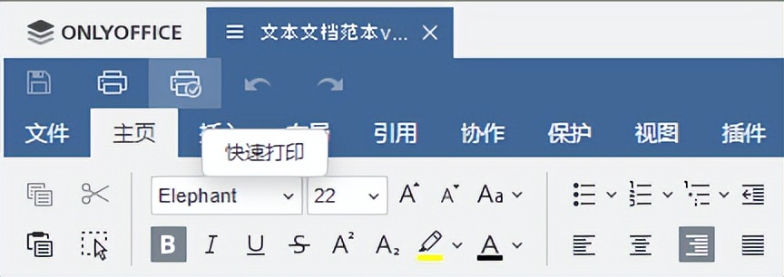 另一种可能会非常实用的功能是快速打印。此功能已在 ONLYOFFICE 桌面编辑器 v7.3 及之后的版本中提供,可在几秒钟内以默认打印设置打印 Word 文档。相应的按钮位于程序界面左上角,就在