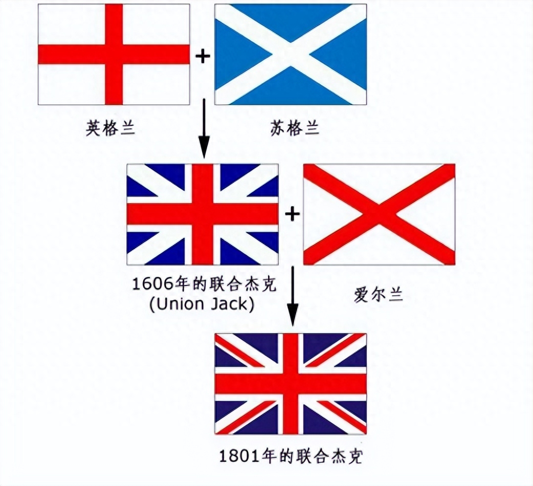 我们再看看英国的国旗就会发现,英国国旗是由英格兰旗、苏格兰旗和爱尔兰旗重叠组成。
