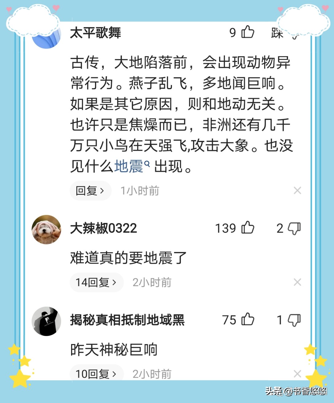有网友甚至引经据典:古传大地陷落前,会出现动物异常行为。燕子乱飞,多地闻巨响,如果是其他原因,则和地动无关,也许只是焦躁而已,非洲还有几千万只小鸟在天强飞攻击大象,也没见什么地震出现。