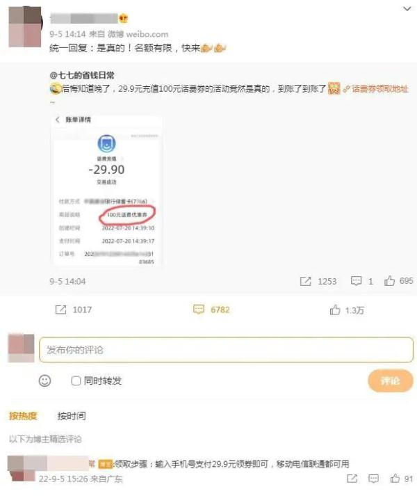 另据了解,类似“29.9元充值100元话费券”的促销信息,除了在微博发帖引流外,还可能在各种平台以“抽奖中奖”的形式出现。
