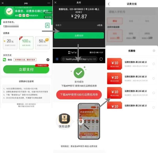 点击支付按钮,页面跳转到微信支付,完成了付费后再次跳转回来,此时,页面上提示支付成功,可以“下载App使用100元话费抵用券”了。