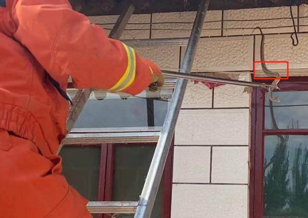 救援人员登上梯子后,用细铁丝将蛇身从侧面勾住防止它乱动,再逼迫它不断缩卷露出更多身体。