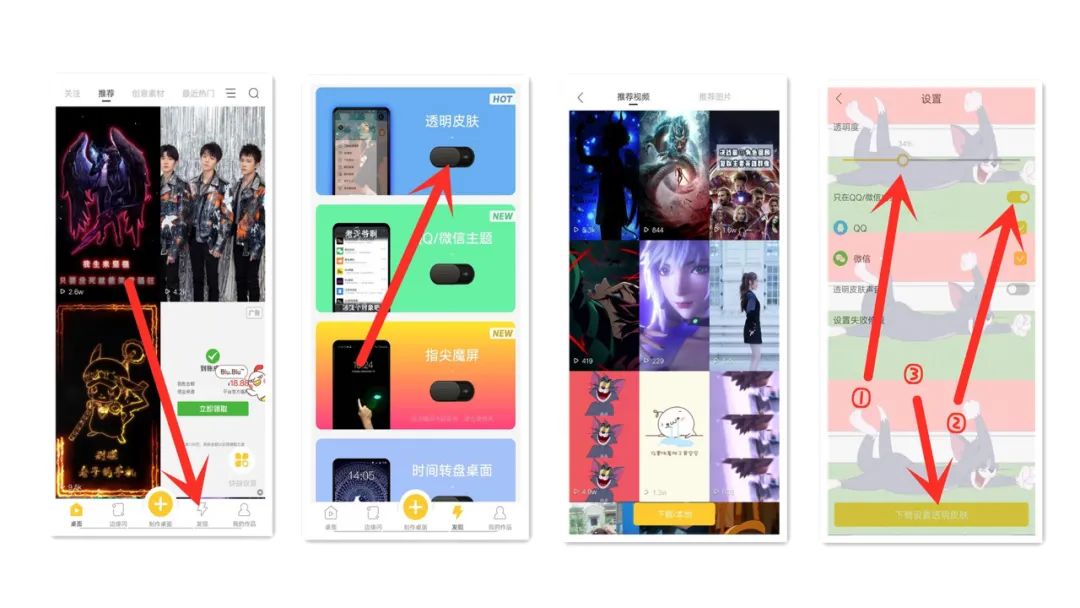 安装完毕之后点击打开,找到下面的发现选项,然后可以看到里面有一个透明皮肤选项,选择打开,接下来按照提示把相应的权限打开,这里呢可以设置视频,也可以设置照片,选择一个自己喜欢的视频,打开之后,第一处可以调节视频的透明度,点开第二处开关之后,视频只会在qq微信上显示,最后一步点击下面的设为透明皮肤就完成了,大家也赶紧去试一下吧。