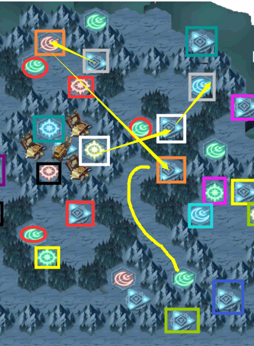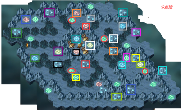 开局从黑色方框开始,把黑色框里面的怪全杀了。这是整个副本最简单的几个怪,杀不过就睡几天再杀。 然后深绿的,注意深绿色传送过去只杀最边上的怪物,200+的怪物不要碰。 蓝色框传送,两个兽族怪都杀了。然后通过绿色月亮回起点。 继续走黑色,这次走紫色传送,倒数第二个怪蝴蝶女妖留能量,最后一个怪物是人族200+的火女。杀完走绿色月亮回原点。 走原点的绿蓝色(我也不知道这是个啥色,有人说白色路线),第二只怪物留能量,最后一只有点难,如果实在杀不过就去走下面的白色试试。我是觉得只要第二只怪物留着满能量,蓝色好杀。走绿色月亮回原点。 走白色框,全杀掉或者留着回来再杀(建议留着回来杀),走灰色杀一只,走红色,杀三只。走黄色,杀两只,注意这里一定不要点错了,走紫色杀完坐绿月亮回原点。除了白色,其他有怪就杀。 下面没做特殊说明就是杀了里面所有怪物。白色->灰色->橙色(倒数第二怪留能量)->绿月亮回原点 白->灰->红->黄->浅绿.浅绿注意先把所有小怪物杀了,最后一只留能量)最好蝴蝶满能量(蝴蝶很重要不能死),不然小蝴蝶容易被苍白秒,杀boss杀不过就从绿色月亮回去。buff好基本能杀过,走月亮回原点。 白->灰->红->黄->浅蓝倒数第二个boss,有狮子,上狮子抗羊头的伤害. 绿框有个怪没杀这时候可以杀了的。 最后的boss把上图中画红圈的绿月亮都踩一遍,然后再踩一个绿月亮就到boss区域了。其实就是把所有月亮踩一遍。注意攒能量,第一个5蛮角,死光盾也不要死蝴蝶。