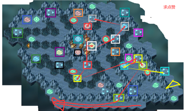 黄色第一步,红色第二步,紫色第三步,红色三角形是留能量。红叉叉就是不要杀。只要这几个杀完了,剩下的就是boss难杀了。