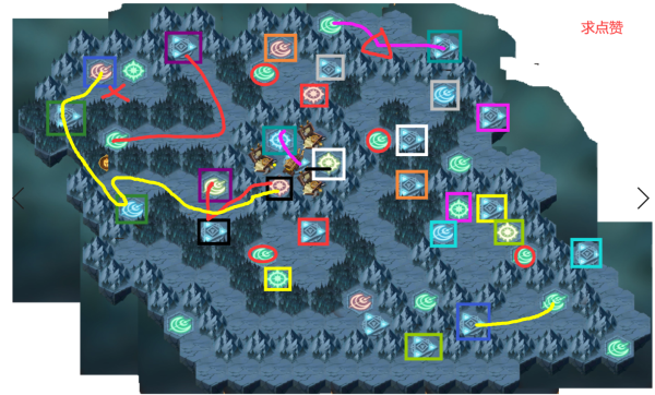 这图是两条路线,在黄色框会分出第二个boss的路线,先红在黄。红色三角让蝴蝶满能量。黄色三角用狮子抗怪。把红圈的绿月亮走完,随便走个绿月亮就能杀最后boss,还是注意攒能量,第一个5蛮角,死光盾也不要死蝴蝶。