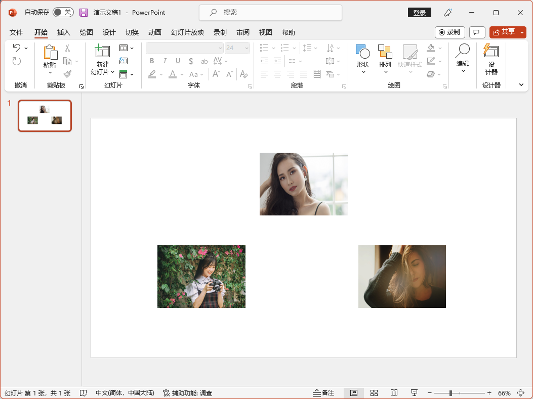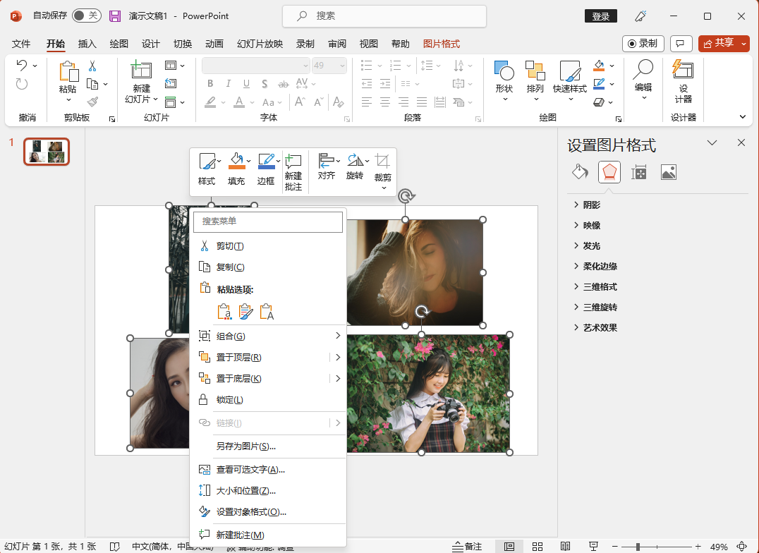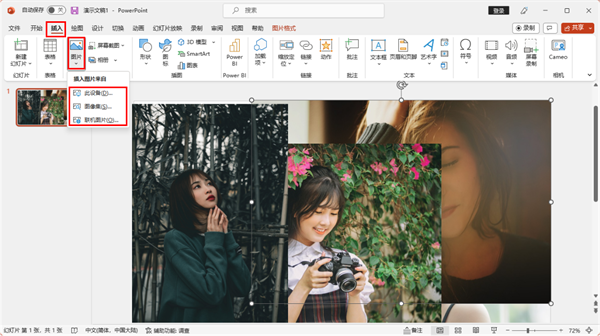 ①首先插入多组图片,并选中所有图片。如果你不小心点了其他地方,可以点击一张图片,然后按【Ctrl + A】选中所有的图片。