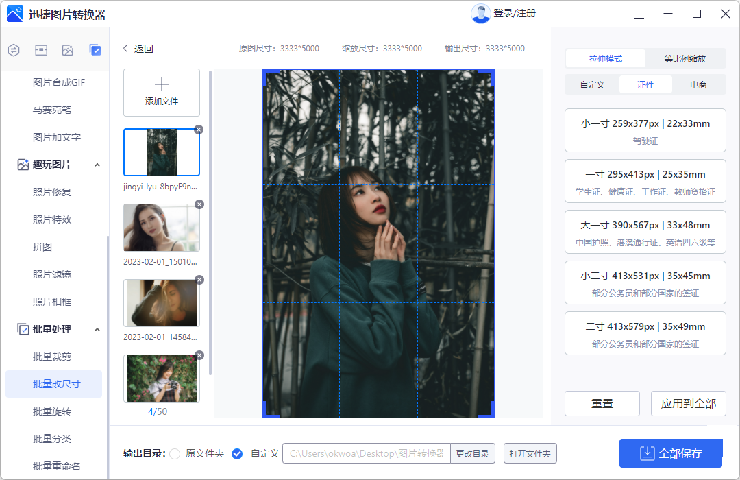 一张张选择后进行设置虽然方便,但是还有更为好用的方法,帮助我们对图片自动统一尺寸。它里面分别有拉伸模式和等比例缩放两种模式,拉伸模式能自定义尺寸,还有证件和电商各种图片的规定尺寸,供大家随心选择。而等比例缩放就是调整全部图片的缩放比例。