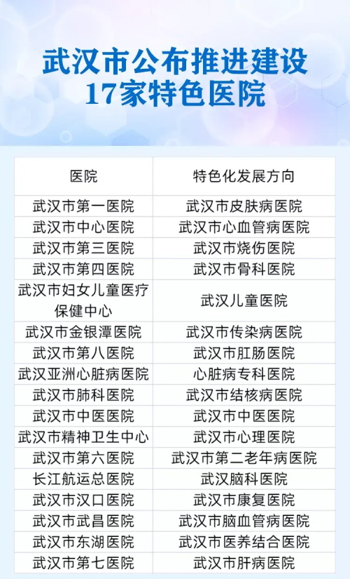 武汉市儿童医院、金银潭医院、肺科医院、精神卫生中心、亚洲心脏病医院