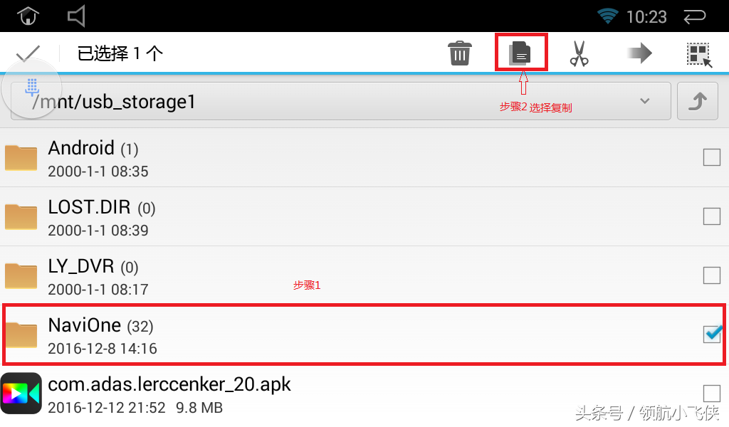 选择粘贴后会进入复制文件界面,此时请保证车辆不要断电等数据复制完成后找到”Navione”的文件夹打开后选择凯立德APP图标进行安装即可