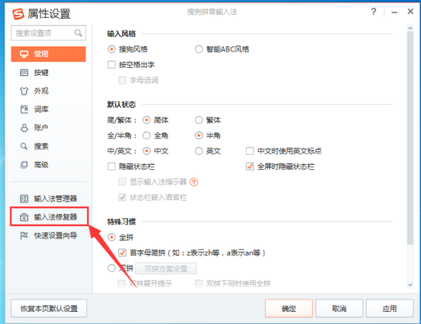 2、接着在属性设置界面左边的下方就能找到“输入法修复器”,点击它进行修复就可以了。