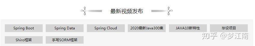 最新视频发布· · Spring Boot· · Spring Data· · Spring Cloud· · 2020最新Java300集· · JAVA10新特性· · 毕设项目· · Shiro框架· · 手写SORM框架