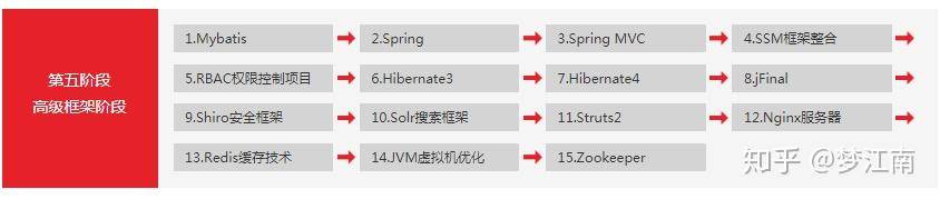 第五阶段 高级框架阶段 1.Mybatis 2.Spring 3.Spring MVC 4.SSM框架整合 5.RBAC权限控制项目 6.Hibernate3 7.Hibernate4 8.jFinal 9.Shiro安全框架 10.Solr搜索框架 11.Struts2 12.Nginx服务器 13.Redis缓存技术 14.JVM虚拟机优化 15.Zookeeper