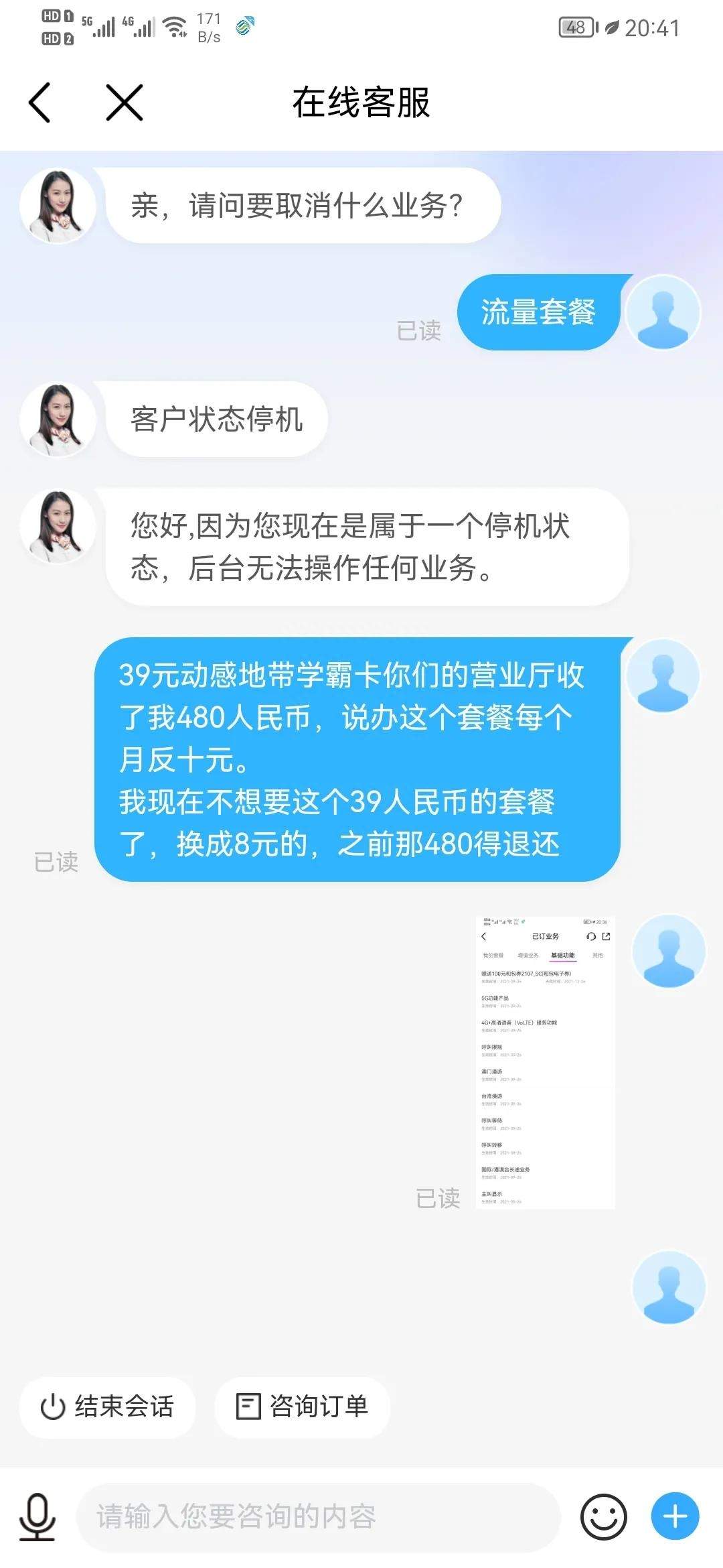 第一次打10086说查不到我的套餐费用,不给退订480。