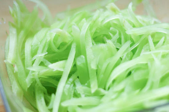 莴笋最常见的做法是切丝清炒,莴笋的皮很厚,削的时候反向削会容易一些。炒莴笋时可以多放油,口感会更顺滑。炒的时间不用太长,用大火快炒至莴笋丝软即可出锅。