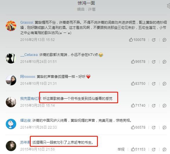 许嵩和黄龄14年合作的《惊鸿一面》都听过吧,没听过的都给我去,南风今天单曲循环给它排面了。下面的评论:狐狸精只一眼就勾引了上京赶考的书生。(真的有内味儿hhhh,绝绝子